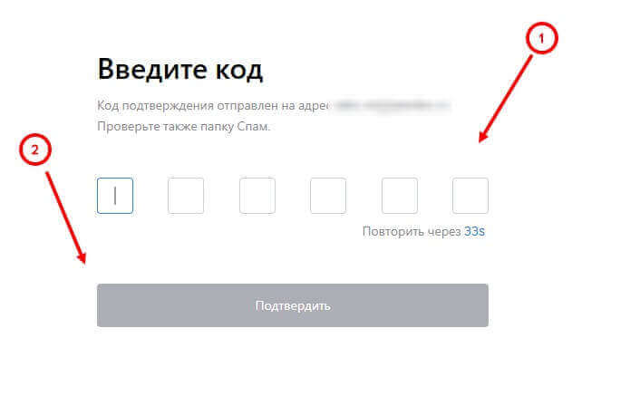 Подтвердите почту или номер телефона кодом из письма или смс сообщения и нажмите на “подтвердить”.