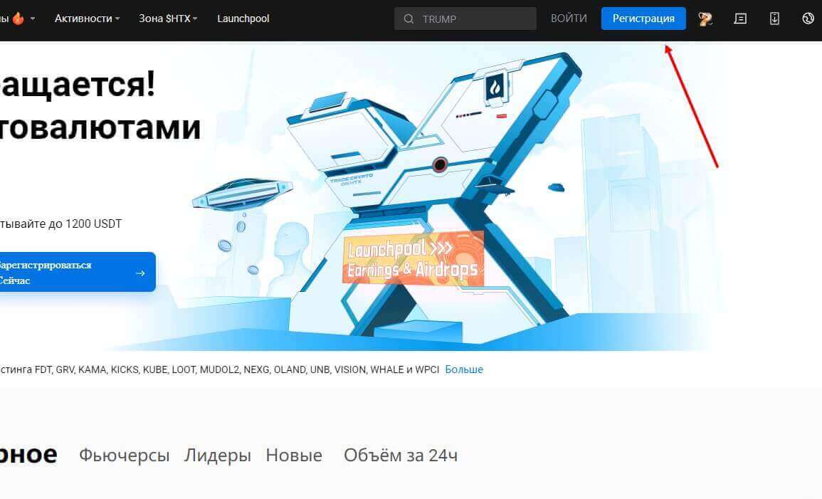 Первое, что нужно сделать – перейти на официальный сайт криптовалютной биржи HTX и в верхней части страницы нажать на “Регистрация”.