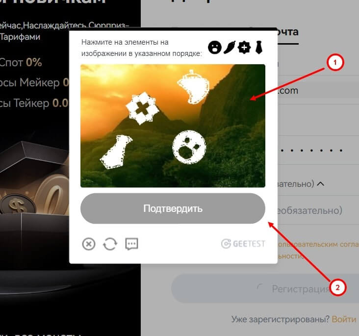 - Пройти капчу, выбрав необходимые изображения по порядку (указано выше капчи). После выбора нажать на кнопку “Подтвердить”.