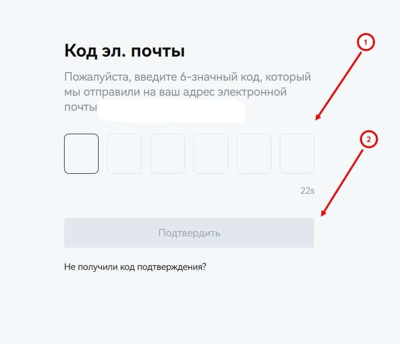 - Подтвердите регистрацию 6-значным кодом, который должен прийти на эл. почту. Если кнопка “Подтвердить” не активировалась автоматически после ввода кода, то нажмите для активации.