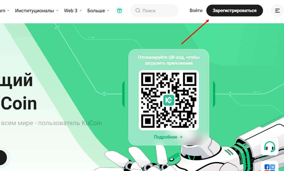 - Перейдите на официальный сайт криптовалютной бирже KuCoin и кликните на кнопку “Зарегистрироваться”, который располагается в верхнем правом углу экрана.