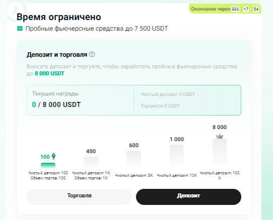 - Наград в 100 USDT для фьючерсной торговли (условие – чистый депозит и объем торгов по 100 USDT);