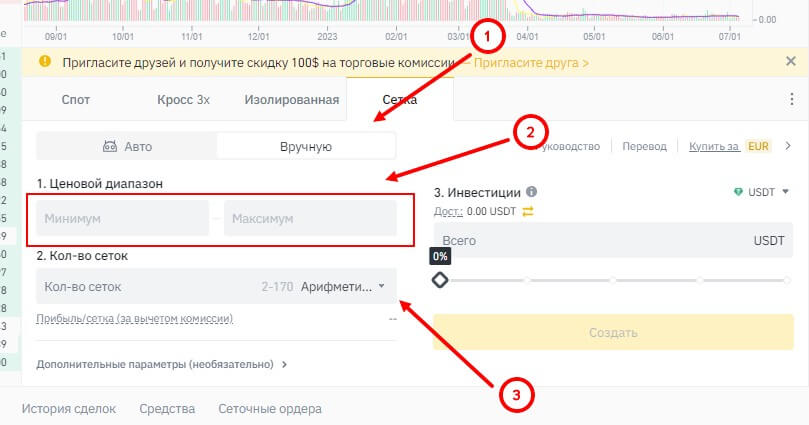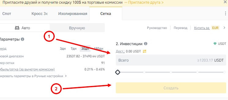Последним шагом станет проверка введенной информации и ввод суммы ваших инвестиций. Затем нужно нажать на кнопку “Создать” и сеточная торговля начнет действовать.