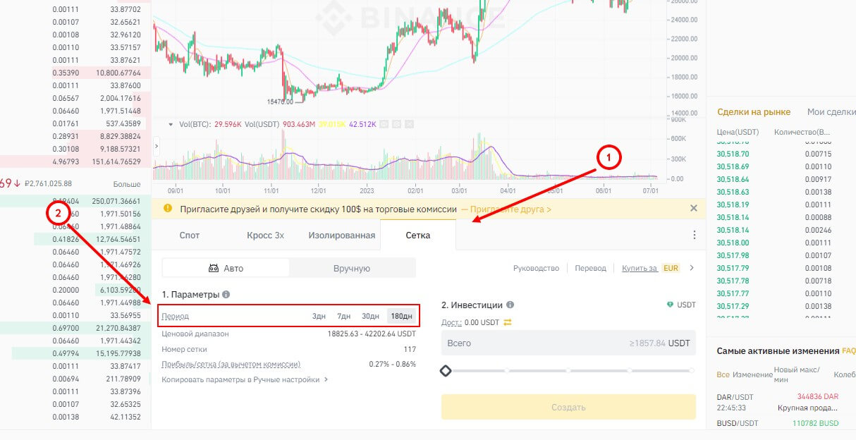 Затем спуститесь в нижнюю часть страницы и выберите раздел “Сетка”. После этого выберите, как будет происходить настройка – в автоматическом режиме или полностью вручную. Если выбрана автоматическая, то в таком случае нужно просто указать период покупки валют – доступно 3, 7, 30 и 180 дней. Все настройки по ценовому диапазону, количество сетки и прибыль за вычетом комиссии будет рассчитываться самостоятельно.
