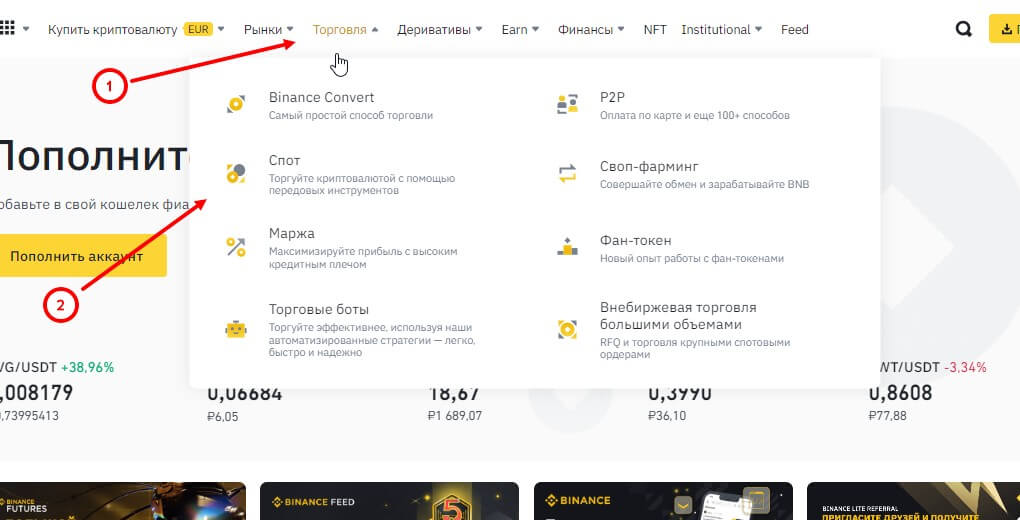 Перейдите на страницу со спотовой торговлей. Чтобы сделать это, наведите в верхнем меню мышкой на пункт “Торговля” и нажмите на раздел “Спот”, чтобы перейти на спотовую торговлю.
