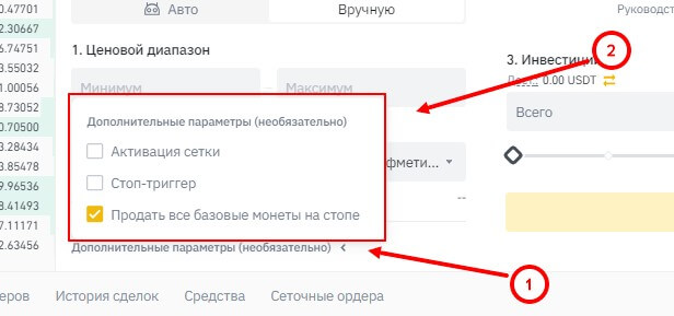 Также пользователь Бинанс может задать дополнительные параметры: активация сетки, стоп-триггеры (стоп-лосс и тейк-профит), а также продажа всех базовых монет, находящихся на столе.