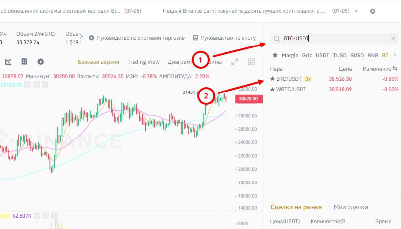 Следующим шагом для работы по системе сеточный трейдинг, станет выбор валюты, которой вы собираете торговать с помощью Grid Trading. Чтобы выбрать валюту, введите в правой части страницу торговую пару или одну валюту, и ниже вы сможете увидеть и выбрать необходимую. В качестве примера выбрали криптовалютную пару BTC/USDT.