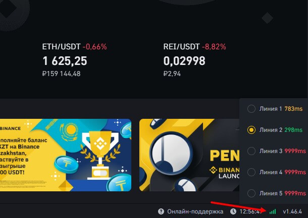 Также программа использует несколько линий передач данных, которые обладают разными значениями пинга (время для передачи данных). Можно свободно переключаться между ними, чтобы получить быстрый доступ к той или иной ситуации на рынке. Располагается данная настройка в нижней правой части программы Binance для ПК.