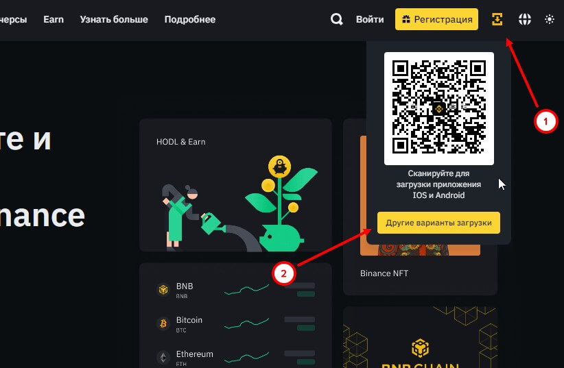 Процедура, связанная с созданием аккаунта стандартная, что и на веб-версии, потому что сам интерфейс почти полностью идентичен. Чтобы зарегистрироваться или авторизоваться в верхней части сайта “Вход” или “Регистрация”. Вся процедура по регистрации на Binance мы разместили в другой нашей статье по ссылке. Пройти можно её за несколько минут.