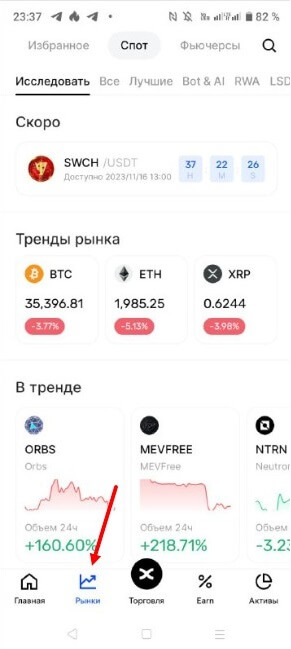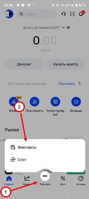 - Торговля (спот/фьючерсы). В приложении можно вести торговлю на любом рынке, как спотовом, таки фьючерсном или маржинальном. Чтобы начать торговлю, необходимо нажать на кнопку “Торговля” и выбрать любой из рынков во всплывающем меню “фьючерсы” или “спот”.