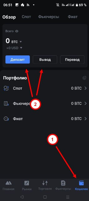 Пополнение и вывод средств осуществляется в разделе “Кошелек”. Чтобы пополнить счет, необходимо нажать на кнопку “Депозит”, а для вывода кликните на кнопку “Вывод”.