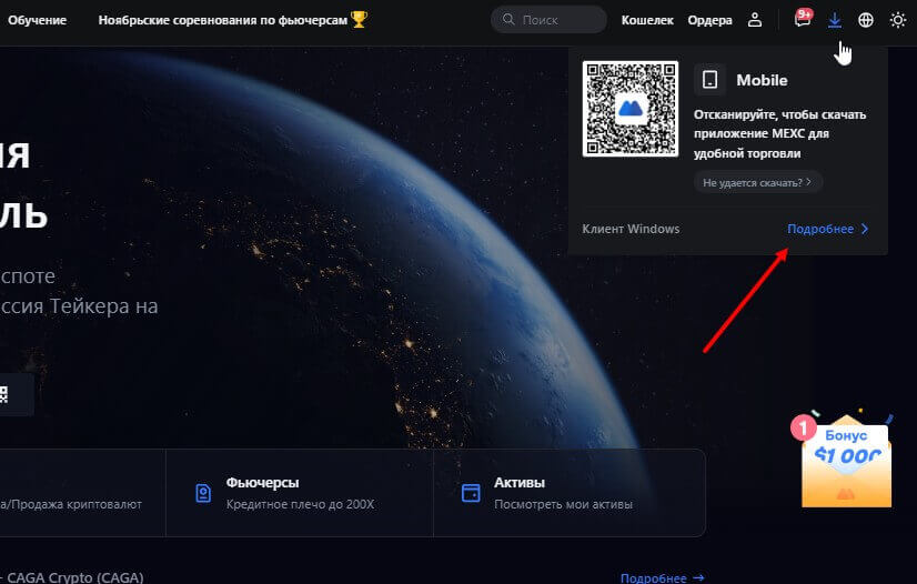 Чтобы скачать программу на любое из устройств, необходимо перейти на официальный сайт торговой биржи МЕКС. Затем следует открыть вкладку со скачиванием приложения – находится она в правом верхнем углу страницы в виде стрелки, направленной вниз. Затем нужно отсканировать QR-код, если планируете скачать программу на телефон.