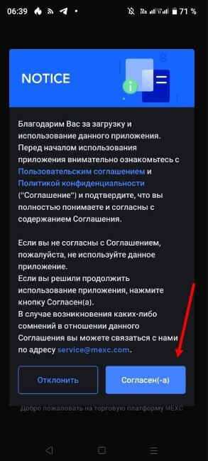 В самом начале откройте приложение, нажав на кнопку “Открыть” в Google Play или нажать на иконку на рабочем экране телефона. Затем после первого открытия приложения нужно согласиться с пользовательским соглашением и политикой конфиденциальности.