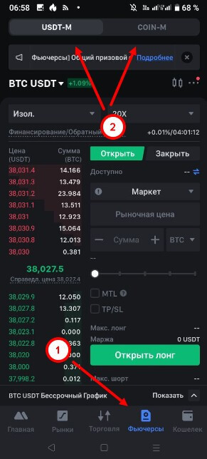 Чтобы начать торговлю на спотовом рынке, необходимо кликнуть на кнопку “Торговля”. А чтобы торговать деривативными контрактами, нажмите на кнопку “Фьючерсы”. Сверху можно выбрать какой тип контракта планируете использовать: USDT-M или COIN-M.