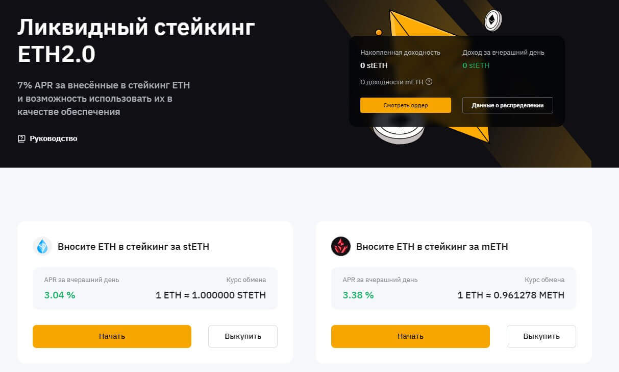 Пользователи могут вложить ETH и получать доход за стейкинг, получив определенный процент. Имеется два типа: внесение ETH за stETH (в сети Lido Stacked Ether) и за mETH (в сети DeFi Mantle). На каждый из вариантов предлагается разный процент – максимальная доходность, предусмотренная для пользователей, 7% годовых.