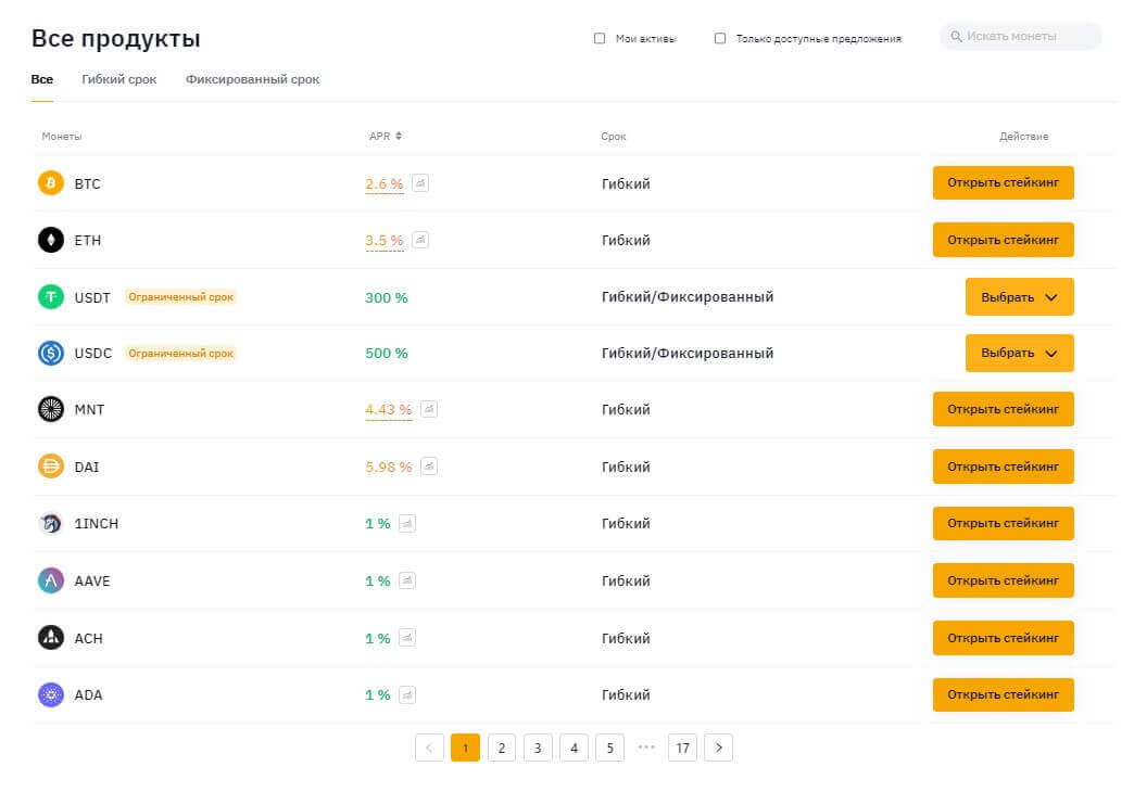 В этом разделе имеется множество продуктов, среди которых USDT, BTC, ETH и так далее. По каждому продукту указан определенных процент доходности в годовых (ARP). Можно вкладывать как на фиксированный срок, так и гибкий стейкинг с ежедневными выплатами.