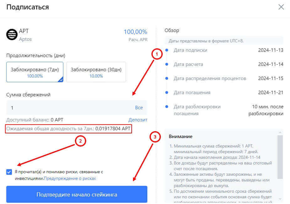 - Оформление заявки. Откроется форма, где нужно указать сумму сбережений (в поле ввода указывается минимальная сумма, например, по токену Aptos под 100% годовых на 7 дней – от 1 APT). В поле “Ожидаемая общая доходность” появится количество токенов, которые можно получить после окончания срока на свой счет. Затем прочитайте и подтвердить риски, связанные с инвестициями и нажмите на кнопку “Подтвердите начало стейкинга”.