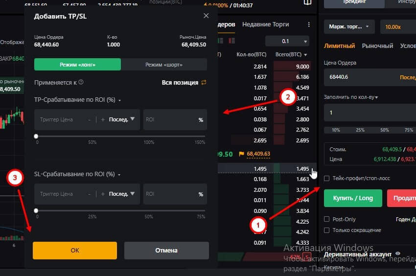 - Закрытие по лимитному ордеру по цене в 70 000 $;