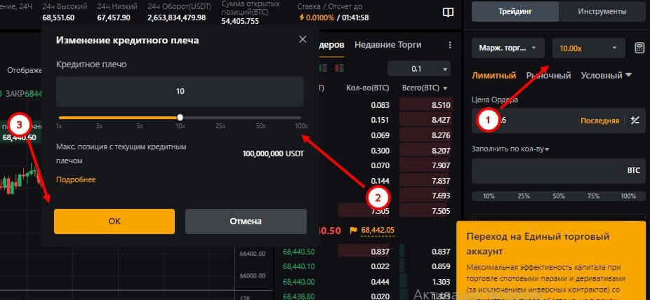 Чтобы изменить уровень кредитного плеча, нажмите на кнопку, которая во многих биржах располагается справа и отрегулируйте, указав необходимое значение (либо написать вручную или же потянуть бегунок).