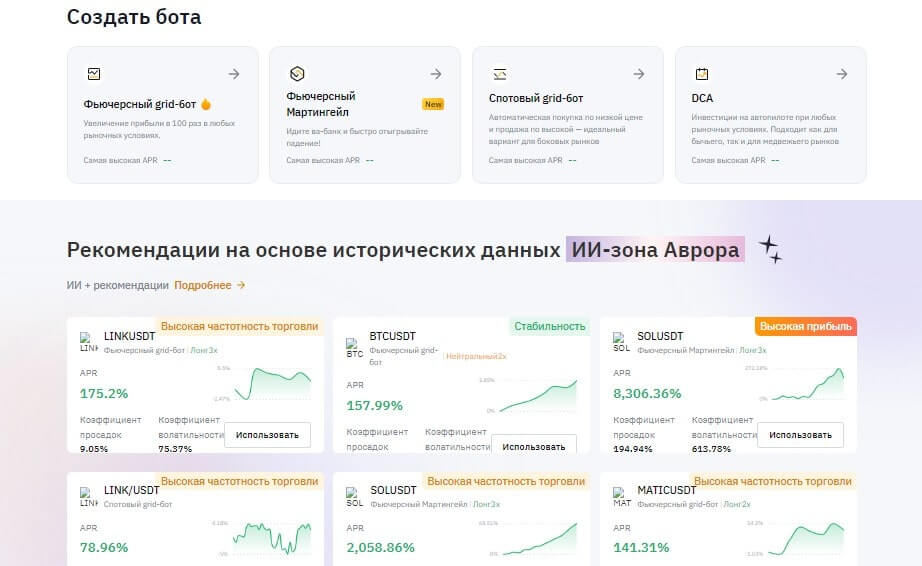 - Фьючерсный Grid бот. Ориентирован на деривативный рынок работая как по позициям шорт или лонг вместе, так и отдельно. Как заявляет компания на официальном сайте, наибольшая ARP доходность за все время более 78 тысяч процентов. Работает более чем со 100 криптоактивов.