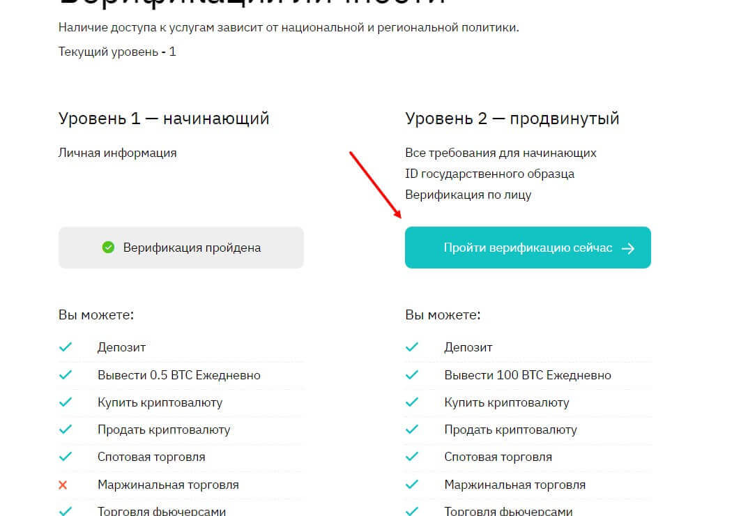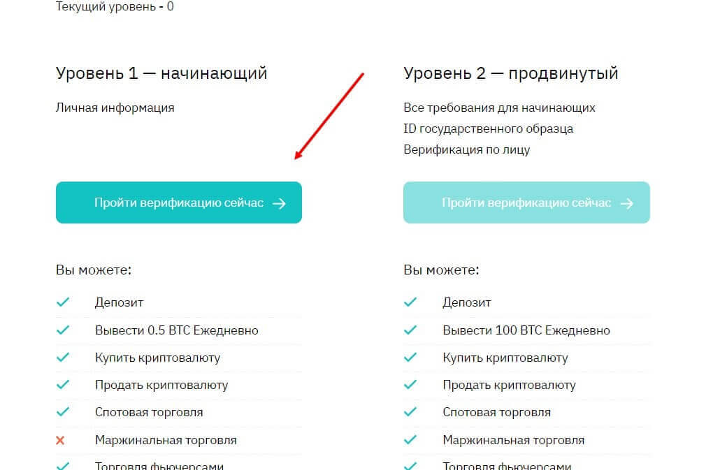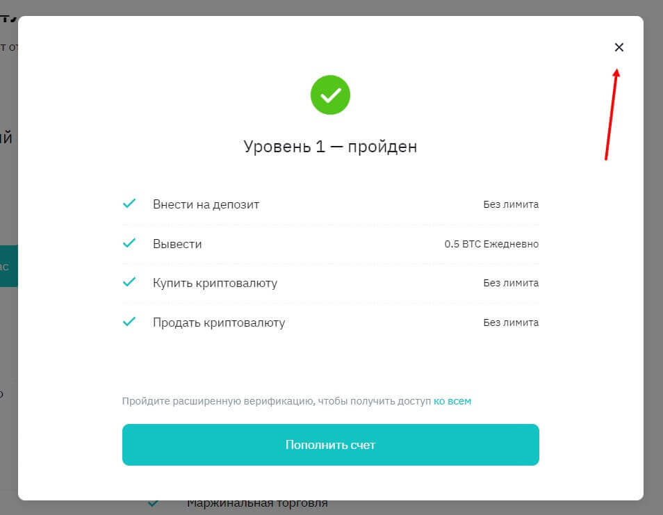 После этого появится сообщение, что первый уровень был пройден. Клиенту станет доступно внесение средств на счет, вывод ежедневно до 0,5 BTC, а также покупка и продажа криптовалюты. Нажмите на крестик сверху, чтобы пройти процедуру дальше и открыть новые возможности площадки.