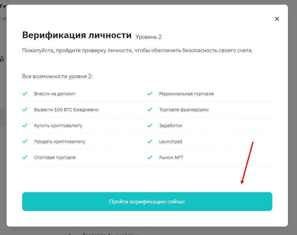 Нажав на кнопку, появится список преимуществ при прохождении данного уровня верификации. Нажмите на кнопку “Пройти верификацию сейчас”.