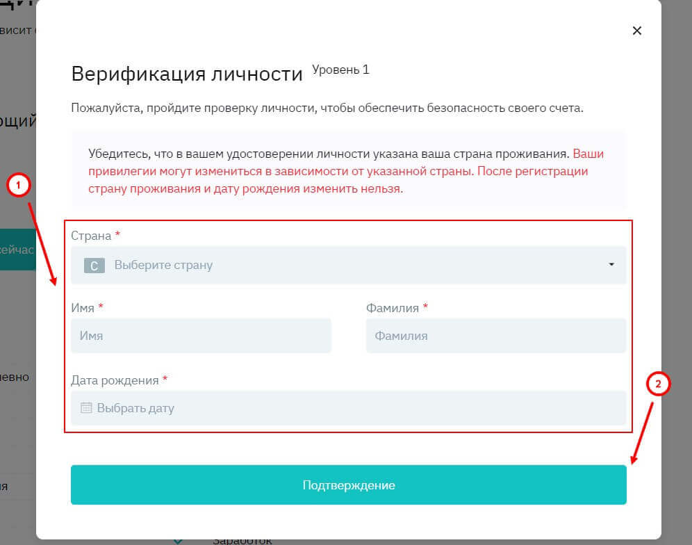После этого появится окно, где нужно выбрать страну проживания из выпадающего списка и укажите имя и фамилию, а также дату рождения. Кликните на зеленую кнопку “Подтверждение”, чтобы продолжить.