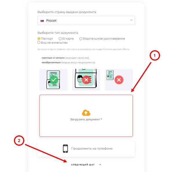 Следующим шагом станет ввод страны и региона выдачи документа удостоверяющего личность и его тип, предоставляемый пользователем (паспорт, ВУ, ID-карта или же ВНЖ). Такие данные требуются из-за требований законов AML и KYC. Затем нажмите на кнопку “Далее”.