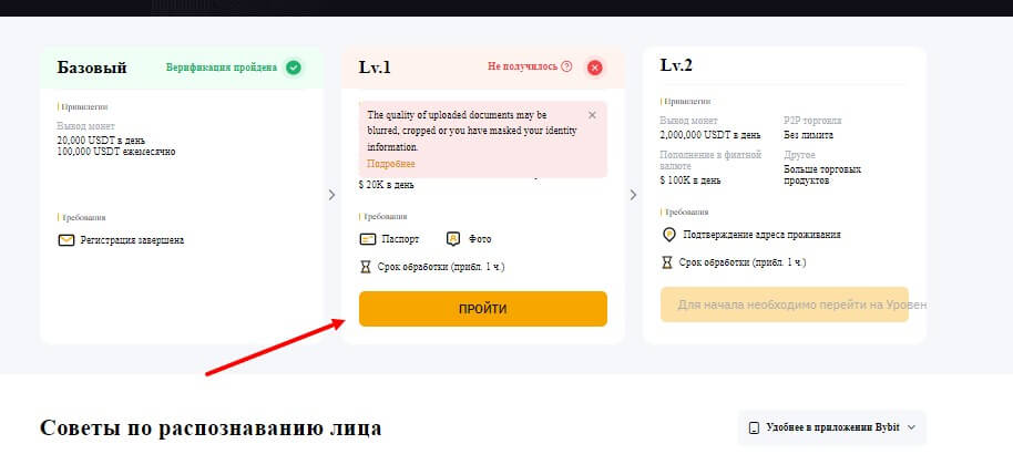 Отметим, что с каждым уровнем лимиты будут выше. А пройти проверку второго уровня не получится, т.к. в начале нужно предоставить свои паспортные данные увеличив свой лимит до 1 000 000 USDT на вывод монет и пополнение в фиате на общую сумму в 20 000$ в сутки. Чтобы пройти первый уровень KYC верификации, следует нажать “Пройти”.