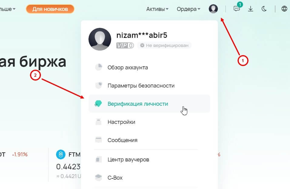 - В правой части открыть всплывающее меню и нажать на кнопку «Верификация личности». Это переведет вас на страницу, где начнется процесс верификации.