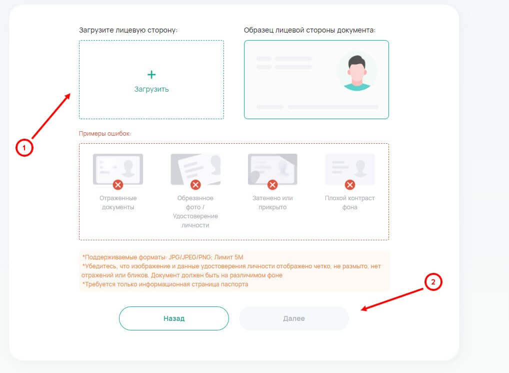 - Затем вы должны будете загрузить документы, подтверждающие личность: паспорт, ВУ или другой документ, признанный на платформе и указанный в прошлом шаге. Следуйте инструкциям по загрузке, обеспечивая четкость и читаемость изображений.