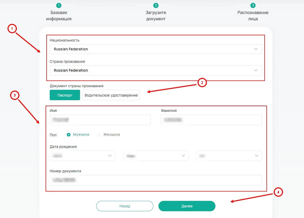 - На первом этапе нужно будет предоставить личные данные, включая национальность, страна проживания имя, фамилию, дату рождения, тип и номер документа. Важно указать точные и актуальные данные, совпадающие с вашим удостоверением личности.