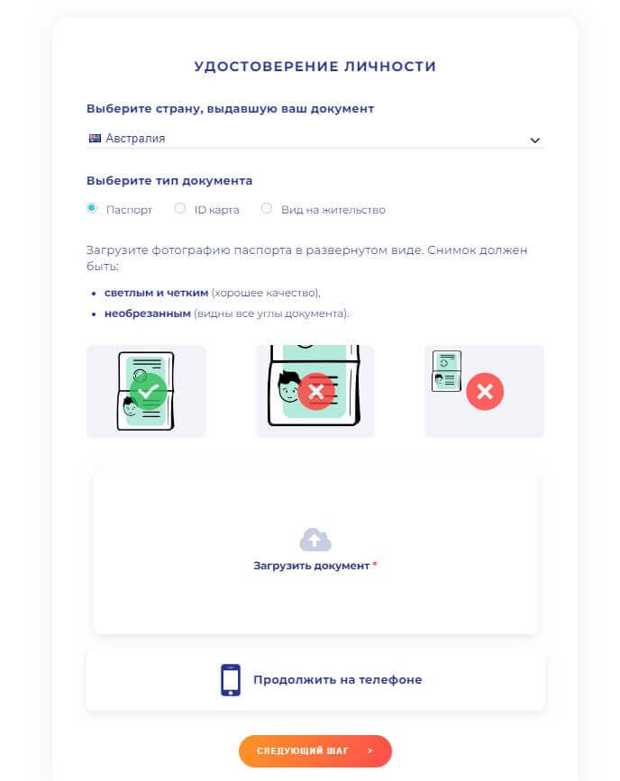 Выберите страну, выдавшую документ и загрузите копию, подтверждающую личность и адрес проживания. Как правило, для этого подойдет паспорт или идентификационное удостоверение определенного государства. Все документы должны быть четко видны, а срок их действия — актуальным.