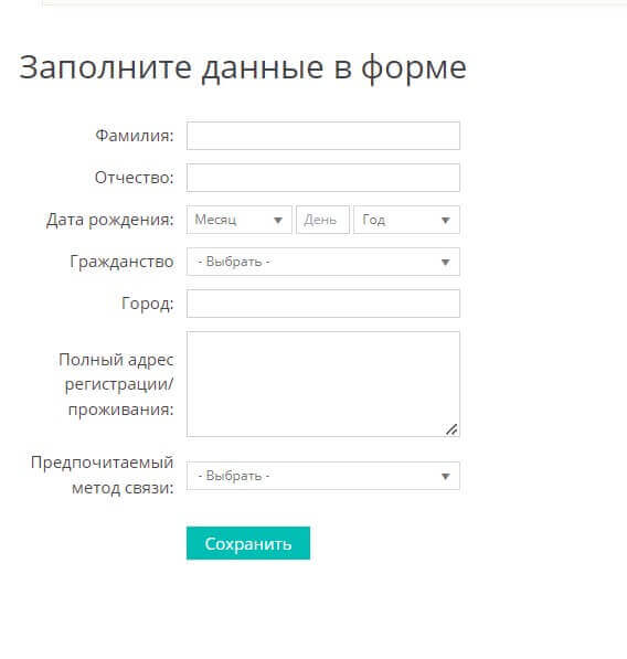 В открывшейся странице нужно указать данные, такие как Фамилия и Отчество, дата рождения, гражданство, город, адрес регистрации/проживания и предпочитаемый метод связи. После этого нужно нажать на кнопку “Сохранить”.
