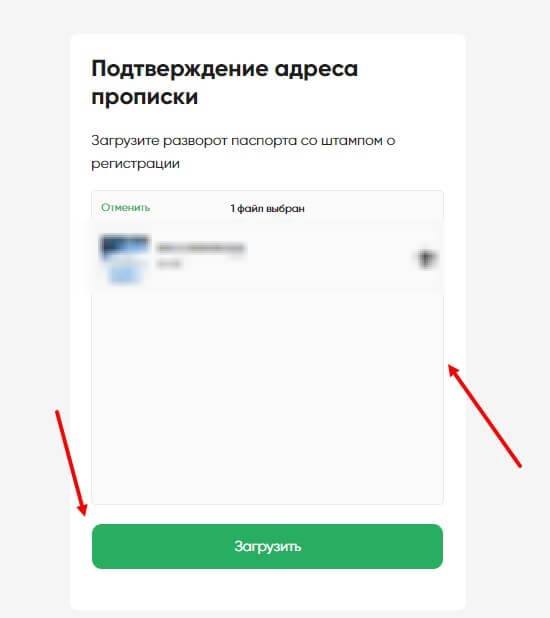 Процедура происходит также, как и выше, только нужно предоставить страницу с пропиской. Загружаете или сфотографируйте документ и также нажмите на кнопку “Загрузить”.
