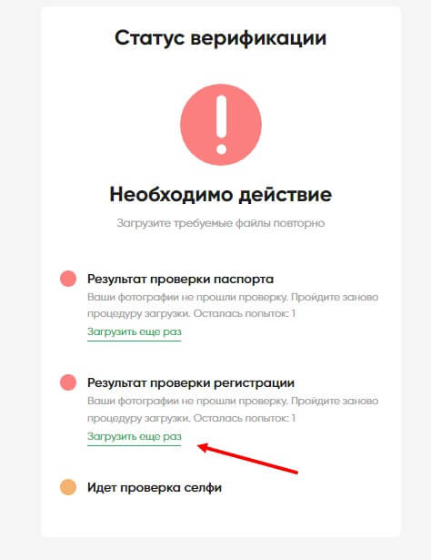 Также иногда система может потребовать прохождения верификации заново – в этом случае могут быть такие проблемы, как недостаточная четкость фотографии. Не пройденные этапы будут помечены красным цветом, а все, что были проведены успешно зеленым. Оранжевым же – то, что проходит проверку. Провести загрузку заново можно, нажав на кнопку “Загрузить ещё раз”.