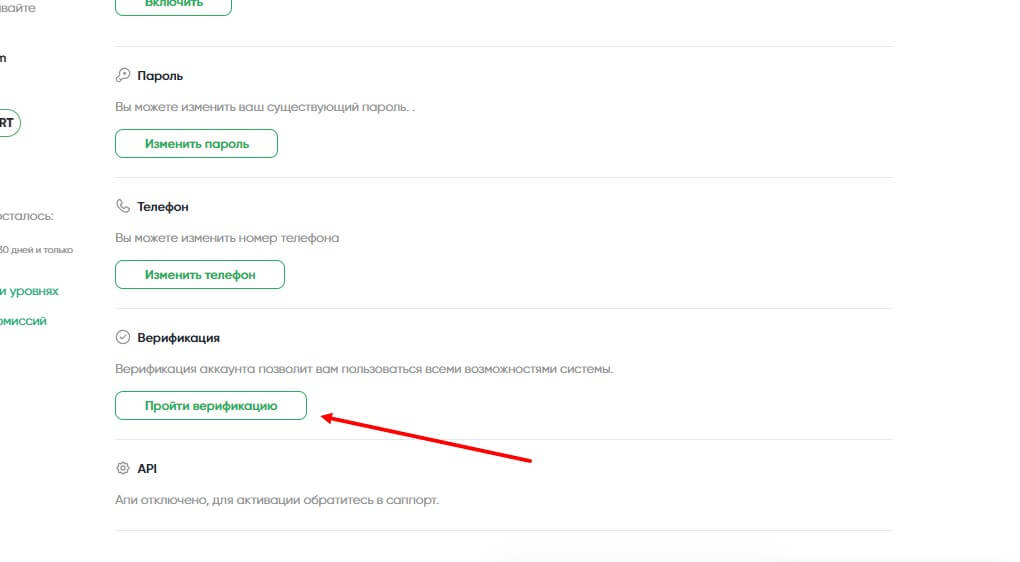 Затем спуститесь ниже и найдите пункт “Верификация”, где следует нажать на кнопку “Пройти верификацию”, чтобы вам открылись новые возможности.