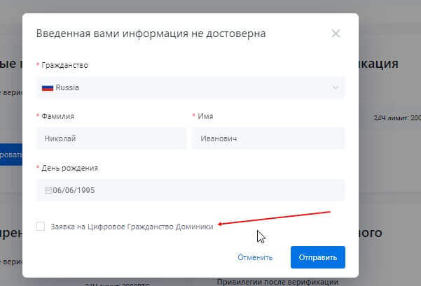 - Необходимо выбрать гражданство, фамилию и имя, а также день вашего рождения. После заполнения информации нажимаете на кнопку “Отправить”.