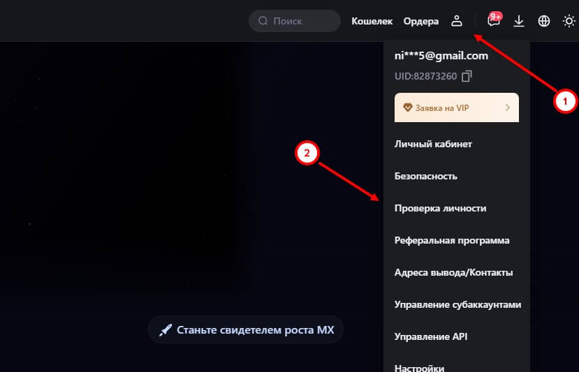 Чтобы верификация MEXC была успешно пройдена, необходимо следовать нескольким шагам, которые помогут завершить процесс без проблем. Первым делом, войдите в свой аккаунт MEXC, используя данные, введенные в процессе регистрации. Как зарегистрироваться на Mexc читайте в нашей статье по ссылке. Нажмите на иконку профиля и выберите раздел «Проверка личности».