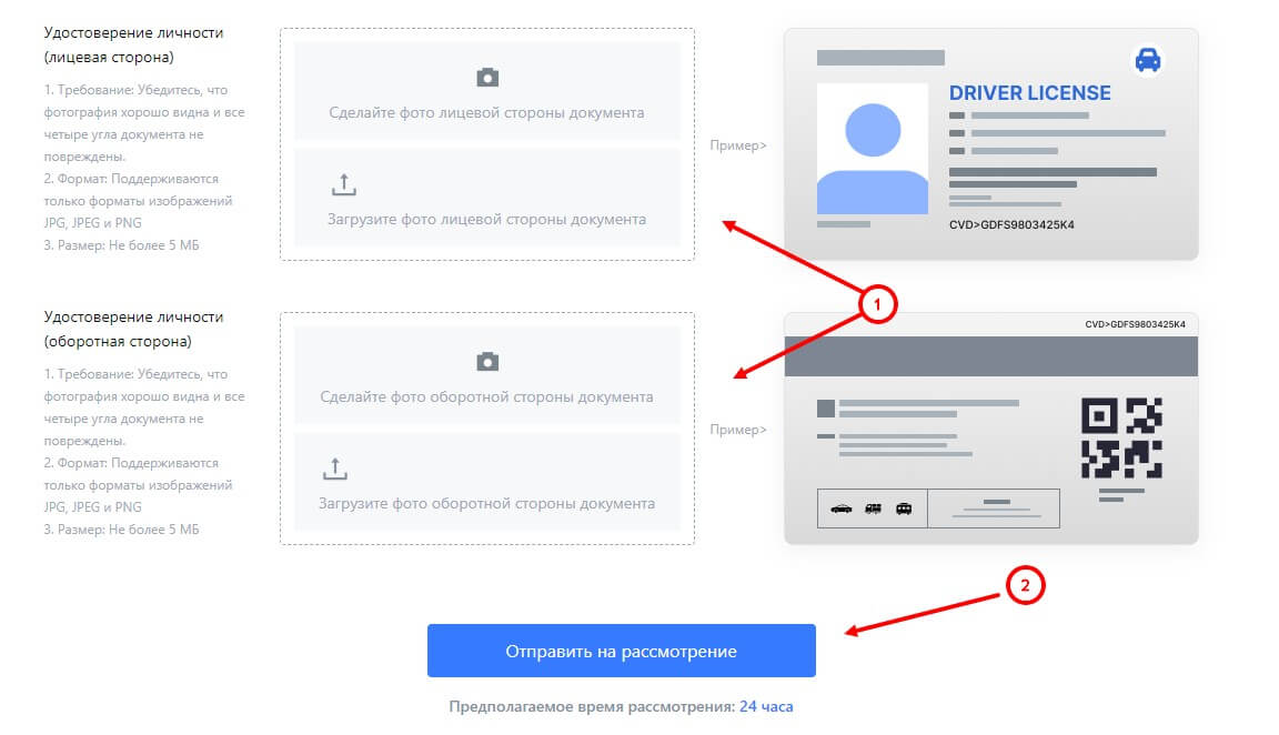 - После этого ниже вас попросят загрузить фотографии вашего документа, подтверждающего личность. Важно, чтобы качество снимков было высоким и на них была чётко видна вся необходимая информация. После загрузки документов система нажмите на кнопку «Отправить на рассмотрение».