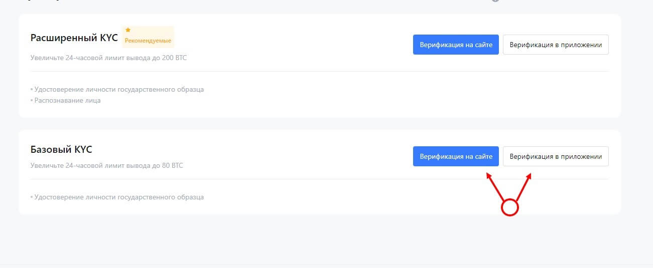 - На странице рядом с пунктом «Базовый KYC» нажмите на кнопку «Верификация на сайте» или «Верификация в приложении», если будете проходить с телефона на базе ОС Android или iOS.