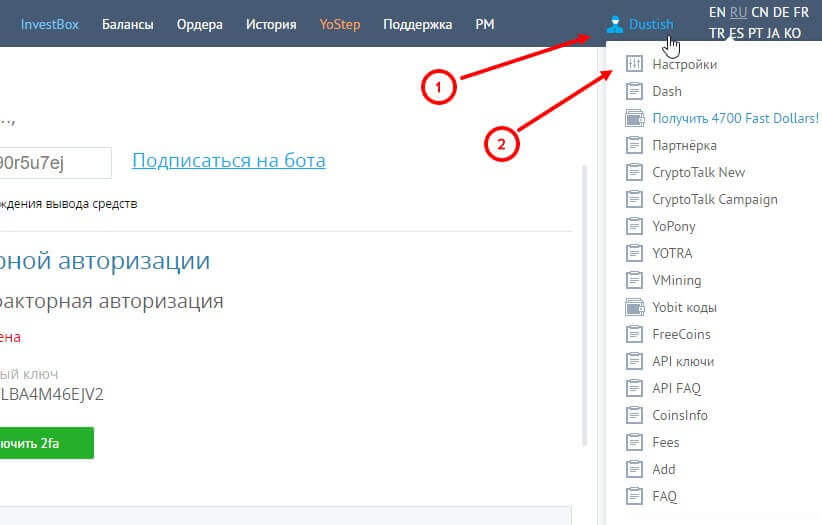 Первая защита безопасности происходит еще в процессе регистрации, где необходимо по ссылке подписаться на бота в телеграмме, о чем мы рассказывали в другой статье, связанной с регистрацией аккаунта. Другим важным моментом – двухфакторная аутентификация (2FA). Чтобы сделать это, откройте раздел настройки, открыв всплывающее меню, наведя на иконку силуэта человека.