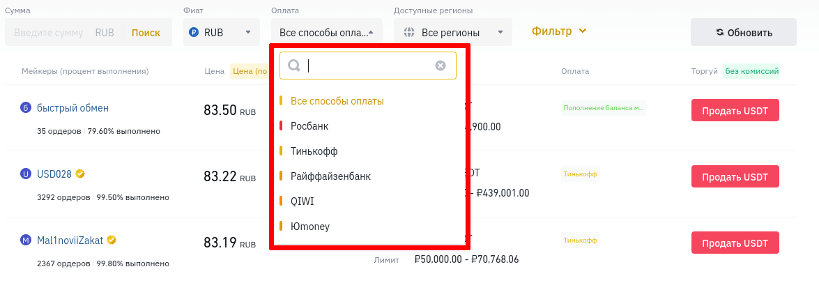 Выбирать конкретные методы оплаты легко благодаря фильтру, при открытии которого открывается обзор всех существующих путей получения фиата, выбрать один или несколько подходящих и увидеть размещенные от покупателей предложения по обмену.