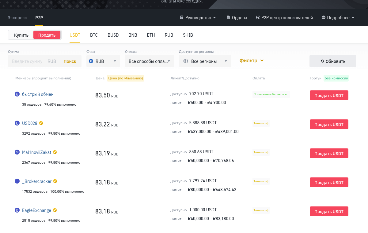 Работа через P2P позволяет выбирать не только подходящие обменные курсы, но и использовать подходящих предложений покупателей. Ниже представлен срез предложений на площадке при выборе пункта «Продать». Обращаем внимание, для каждого покупателя указывается объем предлагаемого минимального вывода.
