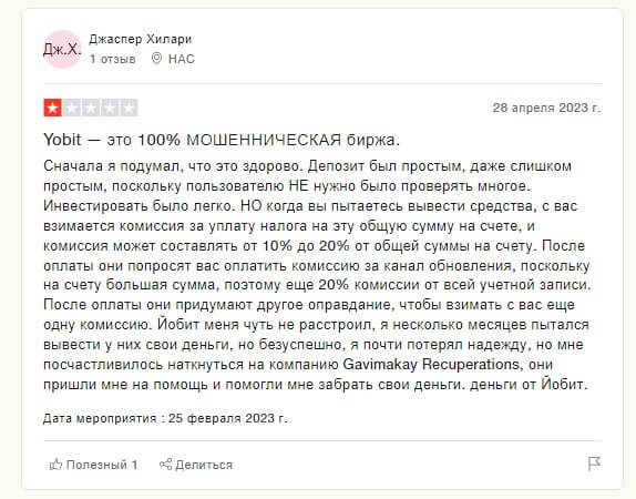 В другом отзыве от Джаспера Хилари, оставленного 28 апреля 2023 года. Пользователь жалуется о проблеме, связанной с выводом средств с личного счета. Во-первых, компания Yobit, по его словам, требует оплатить комиссию за уплату налога в размере 10 – 20%, а затем следуют еще и другие комиссии, взимаемые с клиентов.