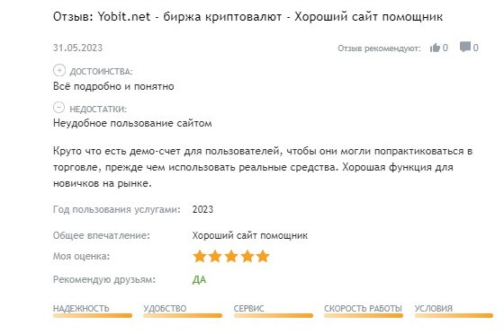 В первом отзыве Yobit, оставленный в мае 2023 года пользователь достаточно кратко рассказал о том, что на сайте все подробно и понятно, однако пользоваться сайтом крайне неудобно. Отметил наличие демо-счета, позволяющего пользователям попрактиковаться перед началом торговли на реальном счету.