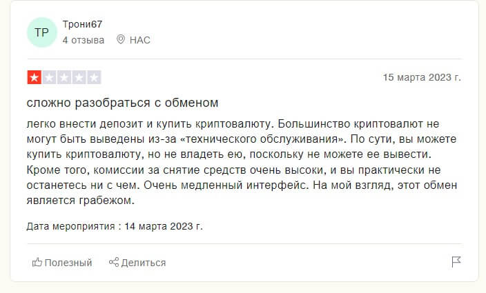 - Однако на TrustPilot некоторые трейдеры жалуются на сложности снятия денег со счета или задержки при выполнении ордеров и необоснованные комиссии со стороны торговой площадки в отзывах о выводе средств. Некоторые пользователи отмечают, что биржа имеет недостаточно высокий уровень безопасности при хранении больших сумм криптовалют.