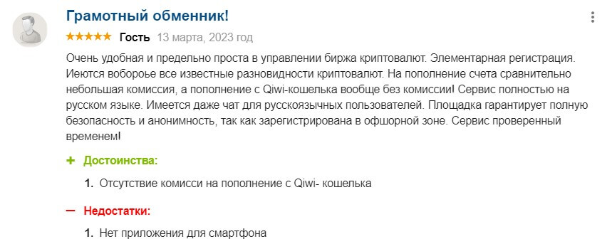 В первом отзыве о yobit.net можно понять, что проект действительно прост и удобен для использования. Пользователь отметил, что имеется множество криптовалютных активов для торговли, а пополнение с Qiwi происходит без комиссий. Сказал и о том, что площадка полностью анонимное и безопасное место для торговли. Единственное, чего не хватило для пользователя – отсутствующее приложение.