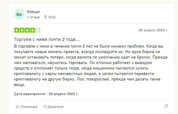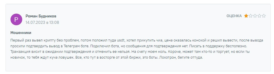 Несмотря на множество положительных отзывов (их больше 80%) есть и негативные отклики, как от этого человека, оставившего собственное мнение. По его словам после удачного вывода средств на второй появились проблемы – вывод средств с подтверждением в телеграм боте. Клиент обвиняется биржу в накрутке отзывов.