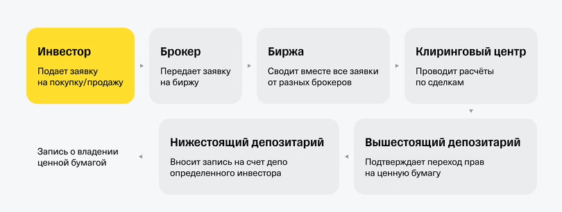 Напрямую с биржи торговать клиент не сможет, поэтому в сделке участвуют третьи стороны, осуществляющие все процессы по взаимодействию с инвесторами. Заявка от инвестора на брокерском счету сразу же отправляется в несколько организаций, проводящих операции. К ним относятся следующие варианты организаций: